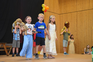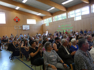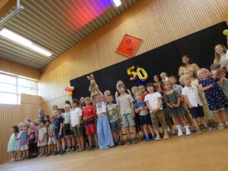 Den feierlichen Auftakt bildete eine Andacht mit Pfarrer Becher, an der sich Kinder, Eltern und Ehrengäste gleichermaßen beteiligten. In Gebeten, Kyrie-Rufen und Fürbitten wurde gemeinsam Dank für 50 Jahre Kindergartenleben ausgesprochen. Im Anschluss begeisterten die Kinder aller drei Gruppen mit einer liebevoll gestalteten Aufführung unter dem Motto „Mit Felix Hase die Welt entdecken“. Die Kinder nahmen die Zuschauer mit auf eine fantasievolle Reise durch verschiedene Länder Europas, untermalt von passenden Liedern, Kulissen und Texten – ein echtes Highlight des Tages. In ihrer Ansprache betonte Kindergartenleiterin Svenja Berger die Bedeutung des Kindergartens für die Gemeinde Train und bedankte sich bei allen, die das Haus in den vergangenen Jahrzehnten unterstützt und mitgetragen haben.