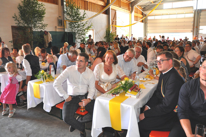 Im Anschluss daran formierte sich der Festzug wieder und machte sich auf den Weg zum Wittmann-Anwesen, wo sich ca. 260 geladene Gäste nach dem Tischgebet das schmackhafte Festmahl von der Metzgerei Seefelder, Jambos gekühlte Getränke und die leckeren selbst gebackenen Torten und Kuchen in der feierlich geschmückten Halle einverleibten.